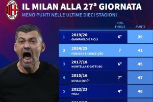 27轮41分是米兰过去10年意甲同期的第二低分,仅高于2019/20赛季的39分,那个赛季球队最终排名意甲第六位。