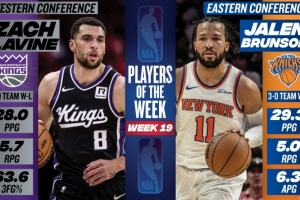 体育资讯3月4日讯 今日NBA官方宣布,国王后卫扎克-拉文和尼克斯后卫杰伦-布伦森分别被评为2024-25赛季第19周东西部周最佳球员。