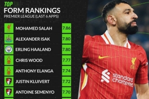 体育资讯2月15日讯 数据结构whoscored统计了近6场英超场均评分情况,萨拉赫重返榜首。