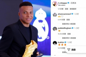 姆巴佩社媒庆祝夺得欧洲金靴奖,队友贝林厄姆称赞其有王者之风