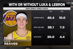 里夫斯场均数据:无詹无东40.4分10助 有詹有东20分4.4助