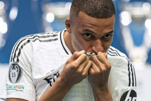 姆巴佩晒出自己亲吻队徽的照片,并写道:123年的伟大历史,生日快乐,皇马。