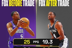 本赛季,福克斯在国王场均25分5篮板6.1助攻,投篮命中率46.9%;在马刺场均19.3分4.2篮板6.6助攻,投篮命中率43.7%。