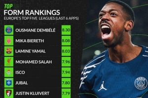 体育资讯3月8日讯 whoscored统计了五大联赛近6场平均评分情况,登贝莱无悬念领跑。