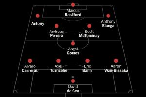 曼联弃将队首发:德赫亚;阿尔瓦罗-费尔南德斯、图安泽贝、拜利、万-比萨卡;安赫尔-戈麦斯、佩雷拉、麦克托米奈;安东尼、拉什福德、伊兰加