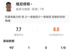 体育资讯3月10日讯 皇马在本轮西甲2-1击败巴列卡诺,维尼修斯本场数据如下: