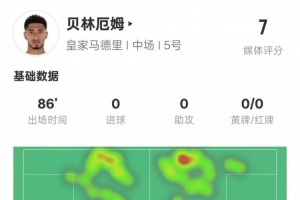 体育资讯3月10日讯 西甲第27轮,皇马对阵巴列卡诺,贝林厄姆首发出战,2次过人成功,12次地面对抗成功,还有6次抢断,评分7.0。