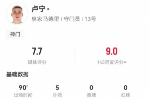 体育资讯3月10日讯 皇马在本轮西甲2-1力克巴列卡诺,卢宁本场数据如下: