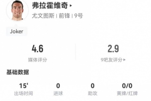 体育资讯3月10日讯 尤文在本轮意甲主场0-4惨败亚特兰大,弗拉霍维奇本场数据如下: