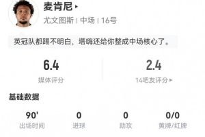 体育资讯3月10日讯 尤文在本轮意甲焦点战主场0-4惨败亚特兰大,麦肯尼本场数据如下: