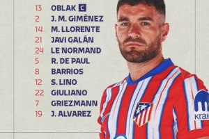 马竞首发:13-奥布拉克、2-吉梅内斯、14-马科斯-略伦特、21-加兰、24-勒诺尔芒、5-德保罗、8-巴勃罗-巴里奥斯、12-利诺、22-朱利亚诺-西蒙尼、7-格列兹曼、19-阿尔瓦雷斯