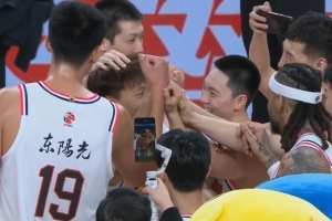比赛结束后,场上出现了很温馨的一幕,广东队的队员们将赵睿围在中间,大家将拳头碰在一起,寒暄说笑。