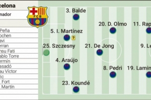 阿斯预测巴萨首发:25-什琴斯尼、3-巴尔德、5-伊尼戈-马丁内斯、4-阿劳霍、23-孔德、21-德容、8-佩德里、20-奥尔莫、11-拉菲尼亚、9-莱万、19-亚马尔
