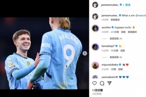 麦卡蒂也在赛后通过社媒晒出自己和哈兰德庆祝进球的合照,并配文:“多棒的一场胜利!@曼城俱乐部”。