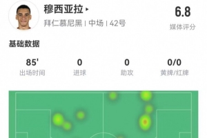 体育资讯2月16日讯 拜仁在本轮德甲客场0-0暂时战平勒沃库森,刚刚顶薪续约的穆西亚拉本场数据如下: