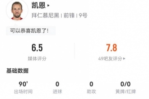 体育资讯2月16日讯 拜仁在本轮德甲0-0逼平勒沃库森,凯恩本场数据如下:
