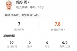 体育资讯2月16日讯 勒沃库森在本轮德甲0-0遭拜仁逼平,维尔茨本场数据如下: