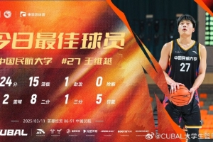 在首都经济贸易大学与中国民航大学的加时鏖战中,中锋王维越以24分15篮板的狂暴数据化身“禁区巨兽”,用63%真实命中率扛起球队攻防大旗。面对首经贸的包夹围剿,这位身披27号战袍的钢铁中锋在篮下11次出手命中8球,其中3次进攻篮板补篮直接转化为关键得分。尽管偶有失误,其高达31%的回合占有率却彰显战术核心价值。5犯离场恰是这场搏杀的勋章,正如那句话所言:“他是那种愿意为每个地板球摔碎膝盖的战士,这座胜利丰碑的基座下,铺满他的汗与铁。”