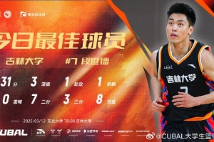 在今日东北大学与吉林大学的强强对话中,吉林大学7号小前锋段世镭以31分3篮板8助攻1抢断的惊艳表现逆风登顶MVP!虽然整个上半场的手感冰凉,但是他从来没有放弃过寻找得分的机会,内突外投不断寻找状态,终于在末节的时候连续的三分轰炸炸开了分差。尽管仅摘下3个后场篮板,但其对防守轮转的精准预判已悄然改变战局,第三节的抢断推反击直接点燃吉林大学反攻浪潮,成功燃爆了主场!