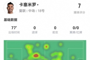体育资讯3月14日讯 曼联在本轮欧联杯2-1领先皇家社会,卡塞米罗本场数据如下: