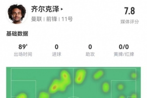 体育资讯3月14日讯 曼联在本轮欧联杯4-1领先皇家社会,齐尔克泽本场数据如下: