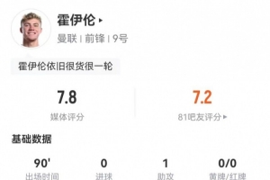 体育资讯3月14日讯 曼联在本轮欧联杯4-1击败皇家社会,霍伊伦本场数据如下:
