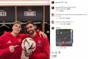 体育资讯3月14日讯 曼联在欧联杯16强战次回合4-1击败皇家社会,加纳乔首发表现出色并送出助攻。
