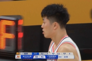 广东球员张皓嘉仅出场10分钟就累计5次个人犯规,三分1中1拿到3分2篮板,正负值-18。