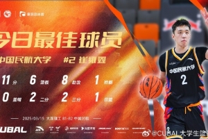 在中国民航大学82-81险胜大连理工的比赛中,中国民航大学2号崔雍鑫以11分8助攻的数据诠释了作为分位的他同样能胜任控卫的工作。尽管三分线外9投仅2中,其手术刀般的传球却刀刀见血——8次助攻直接创造21分,包括终场逆转比分的制胜三分。当技术统计表上赫然标注“0失误”,这位身披2号战袍的节奏大师,用绝对控场力撕碎对手防线:4次后场篮板快速发动反击,更以1次关键抢断掐灭大稳住局势。这场比赛充分证明:当战术齿轮精密咬合时,得分后卫也可以化身双能卫成为胜利的隐形引擎。