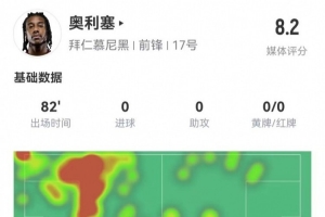 体育资讯3月16日讯 拜仁在本轮德甲1-1暂时战平柏林联,奥利塞本场数据如下: