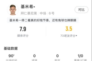 体育资讯3月16日讯 德甲第26轮,拜仁1-1战平柏林联合,基米希首发出战打满全场,赛后获评7.9分,仅次于获评8.2分的奥利塞。