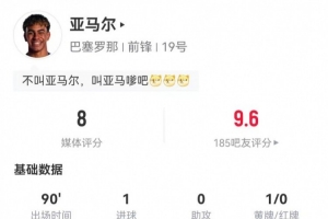 体育资讯3月17日讯 巴萨在本轮西甲4-2逆转马竞,亚马尔本场数据如下: