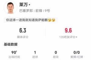 体育资讯3月17日讯 巴萨在本轮西甲4-2逆转马竞,莱万本场数据如下: