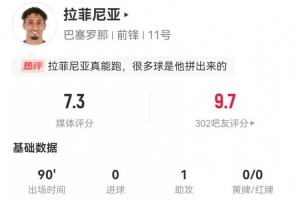 体育资讯3月17日讯 巴萨在本轮西甲4-2逆转马竞,拉菲尼亚本场数据如下: