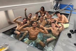 此役过后,巴萨少赛一轮与皇马同积60分,排名西甲榜首,巴萨球员们赛后在浴池里合影,庆祝胜利。
