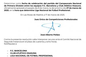 体育资讯03月17日讯 西甲官方发布公告,巴萨vs奥萨苏纳补赛将于3月27日进行。