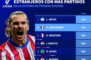 据德国转会市场统计,此役过后,格列兹曼已出战520场西甲比赛,与梅西并列排名西甲历史外援出场榜首位。