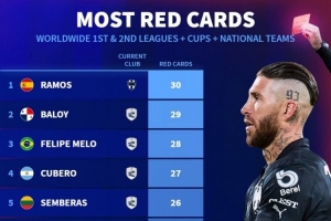 德转列球员染红次数排名(一级+二级联赛+杯赛+国家队):