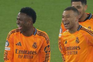 之后镜头给到皇马球员,维尼修斯和贝林在和姆巴佩说笑,维尼修斯还比了个手势。