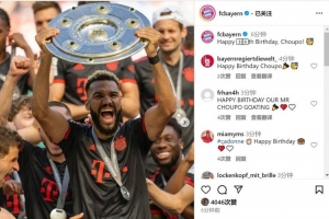 体育资讯3月23日讯 今天是喀麦隆前锋舒波莫廷的36岁生日,老东家拜仁为他送上祝福。