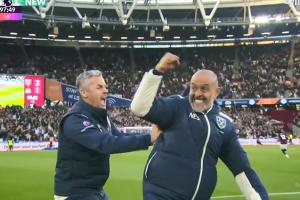 不容易!取得上任后首胜,努诺场边与教练组激动相拥