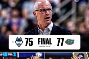 体育资讯3月24日讯 NCAA疯三次轮全部结束,其中一场较量,卫冕冠军康涅狄格大学75比77不敌佛罗里达大学,止步32强,无缘3连冠。