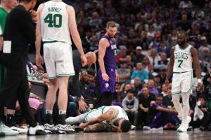 比赛第三节还剩3分35秒时,塔图姆出手三分后被小萨垫脚,痛苦捂脚,但还是坚持执行了罚球,随后自行离场。