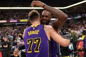 东契奇晒出他拥抱詹姆斯庆祝后者绝杀的照片,配文道:“@詹姆斯 🔥🔥”