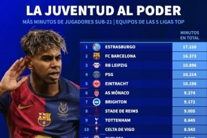 体育资讯3月27日讯 德国转会市场统计了本赛季五大联赛球队U21球员的总出场时间,并列出榜单,斯特拉斯堡居首,巴塞罗那、莱比锡排名二三位。