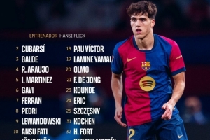体育资讯3月27日讯 北京时间明天凌晨4点,巴萨将在西甲第27轮补赛中主场对阵奥萨苏纳,巴萨公布了此役的球员名单,莱万、亚马尔、佩德里、库巴西、阿劳霍、伊尼戈(通过体检)在列,拉菲尼亚、卡萨多缺席。