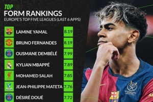 体育资讯3月28日讯 国家队比赛周已经结束,whoscored统计了五大联赛此前6轮的场均评分情况,亚马尔和B费并列居首。
