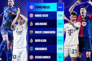 体育资讯3月28日讯 本赛季欧冠8强已经全部诞生,分别为阿森纳、皇马、巴黎圣日耳曼、维拉、巴萨、多特、拜仁以及国米。欧足联官方统计了8强中出战欧冠比赛场次最多的球员top10,穆勒以161场居首,诺伊尔150场位居次席。