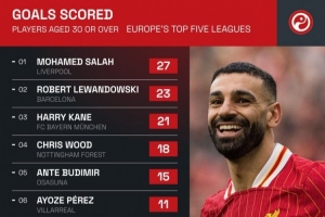 本赛季五大联赛30岁及以上球员联赛进球榜: