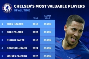 德转列切尔西队史身价最高榜:阿扎尔18年1.5亿,帕尔默去年1.3亿
